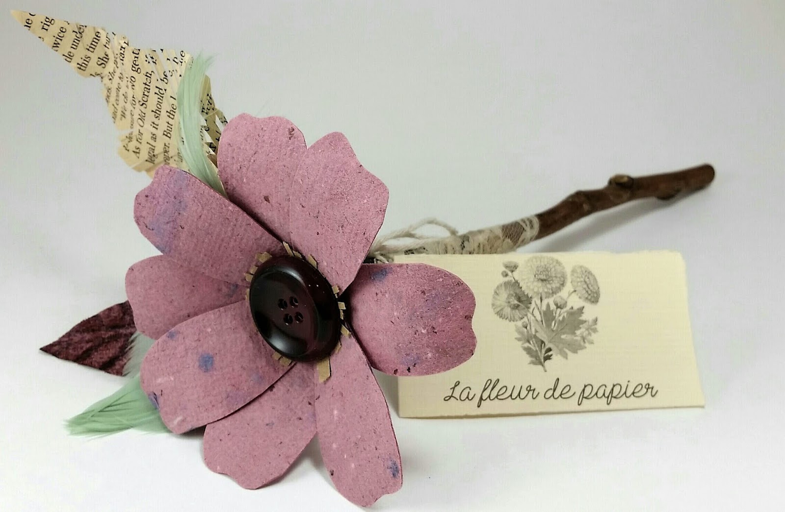 I am inspired by repurposing items, so when it came time to plan our wedding, instead of using fresh flowers, I decided to make my own from various found elements. I got to work using a stack of handmade paper that I had pulled in a class, a mountain of vintage buttons that had been waiting for me to use them, a stage of twigs that I collected from a local source, and other baubles. They fit our book theme perfectly and I loved them so much that I decided to continue to create these lovely ladies.